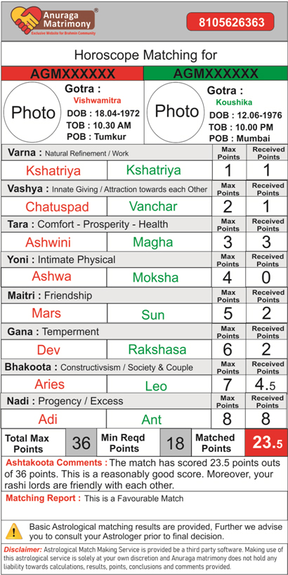 of Ashtakoot Matching details (Which Includes Matching of Varna, Vashya, Tara (Star), Yoni, Maitri